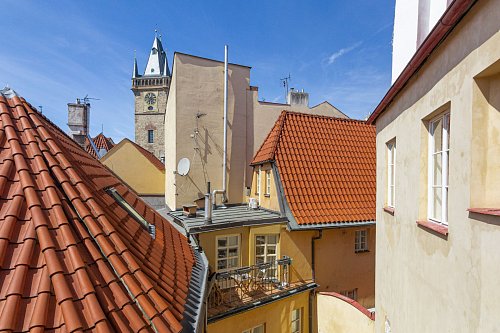 Byt se nachází v klidné části historického centra, což vytváří unikátní kombinaci absolutní dostupnosti všeho dění a zároveň příjemného soukromí. Z oken se otevírá výjimečný výhled přímo na Pražský orloj – ikonický symbol Prahy, který dodává této nemovitosti neopakovatelnou atmosféru.